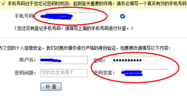 准确填写手机号码,用户名密码以及原密码问题的答案,填写完成之后点击"补登",会提示您操作 成功,点击确定即可。 ⑥然后页面会自动回到刚才的补登页面,这时点击手机号码下方的"发送验证短信",如图: